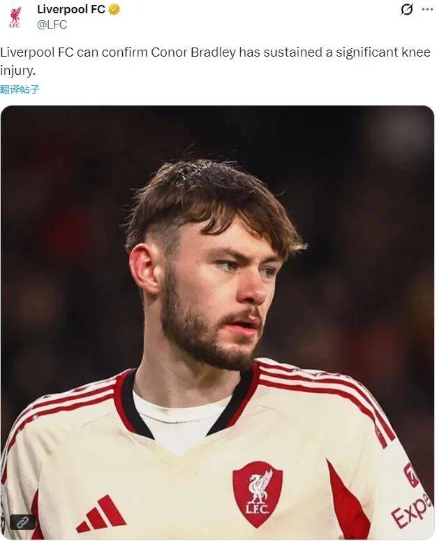 官方:利物浦宣布布拉德利膝盖严重受伤,这名右后卫将在未来几天接受手术,然后开启自己的康复进程。