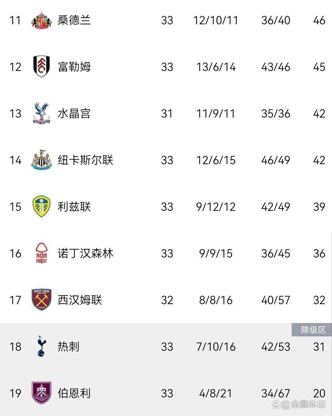 在积分榜的另一端,保级形势发生了清晰的变化。 诺丁汉森林积36分,西汉姆联少赛一场积32分,而托特纳姆热刺在主场2-2战平布莱顿后,积分仍然停留在31分,排名联赛倒数第三,深陷降级区。 热刺已经连续15轮英超未能取胜,创造了队史在顶级联赛的最长不胜纪录。 他们33场比赛丢了53个球,防守数据排在英超倒数第四。 目前,狼队和伯恩利基本已经无力回天,降级的第三个名额,极有可能在热刺和西汉姆联之间产生。